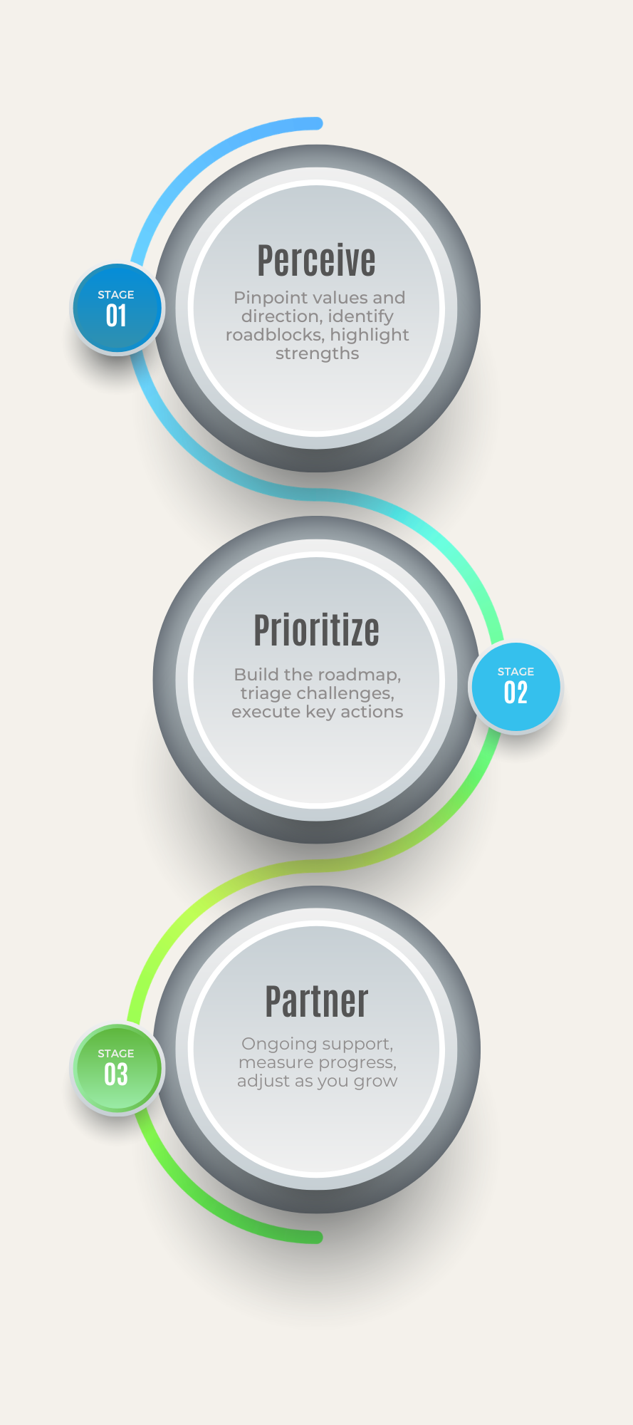Perceive: Clarify what you’re driving toward and where you bring the most value. Surface the barriers holding you back so you can move ahead with confidence.